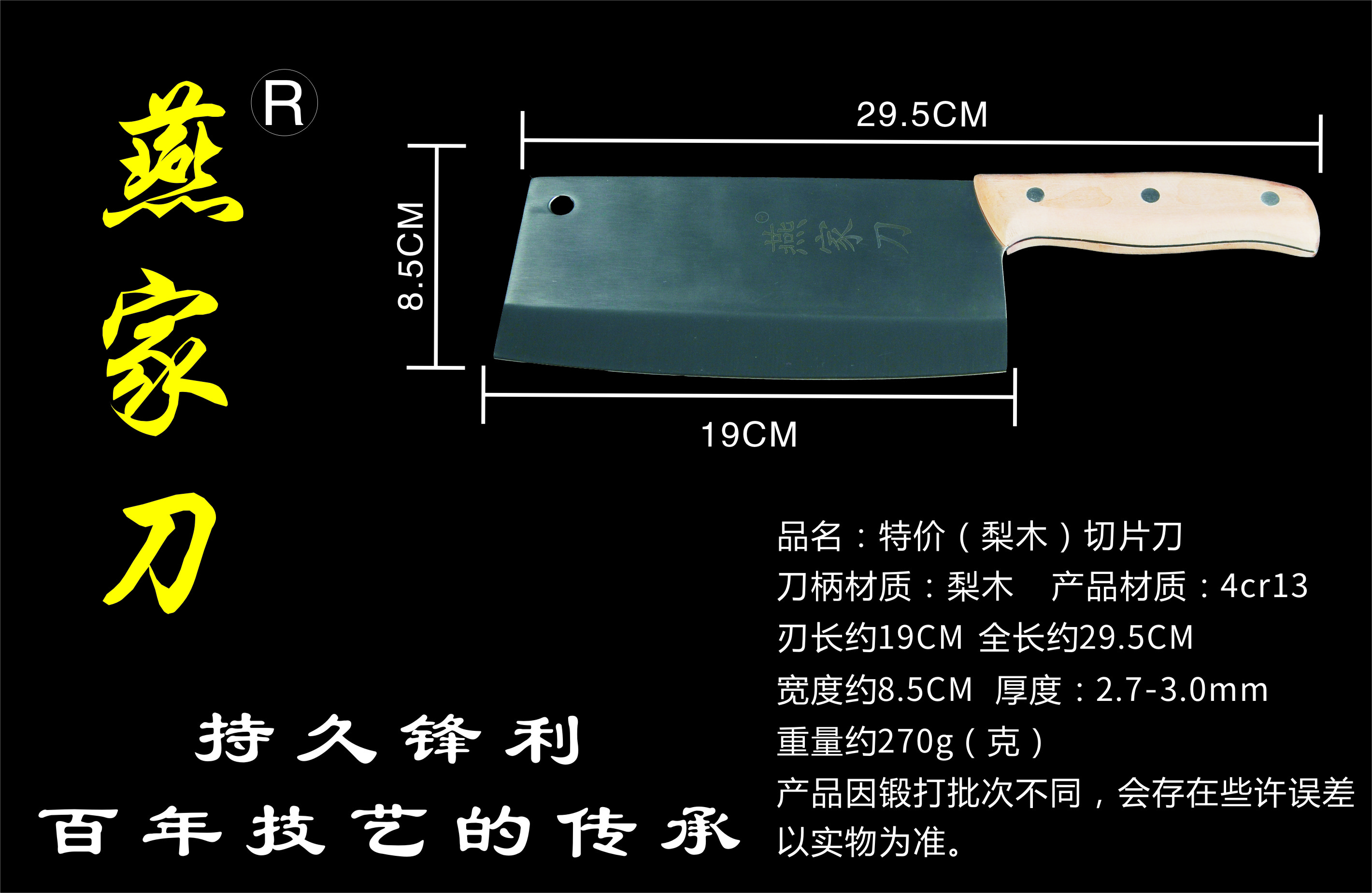 樂(lè)山燕家刀具有限公司(公司前身為燕佳鐵匠鋪),公司坐落于美麗的佛都之鄉(xiāng)樂(lè)山嘉州,在全國(guó)各地有上千家代理經(jīng)銷點(diǎn),公司專業(yè)銷售、設(shè)計(jì)、制作各類刀具。秉承一貫鍛造三精要求,即選料精、用料精、工藝精。所選材料全部產(chǎn)自滇東鐵礦優(yōu)產(chǎn)區(qū)。本品牌刀具堅(jiān)持千挑萬(wàn)選為材,千錘百煉為刀的手工鍛造工藝宗旨。具有鋒利耐磨、持久耐用,用料上乘,硬度高、韌度強(qiáng)的特點(diǎn)!